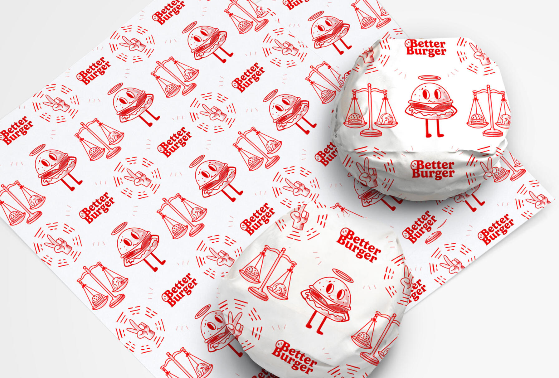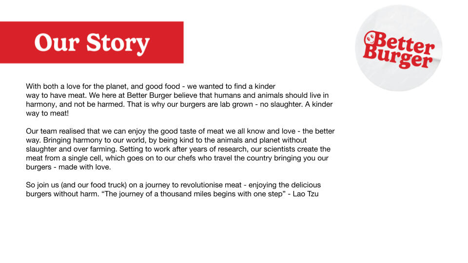 Better Burger - a brief from Moving Brands to design from themes picked out of a hat: lab grown meat and taoism.In an identity brief given by Moving Brands this began with a workshop where we were given a random philosophy and industry to create an unusual brand identity. I was given lab grown meat and Taoism. So I designed an identity for a food truck that can travel around and introduce more people to lab grown meat. As lab grown meat is still very new and people may be wary of it I focused on very friendly and playful branding. Although the meat is made in a new way, the burgers still taste the same way we all know and love - therefore there was a lot of influence from 50s diners for example with the red colour of the iconic booth seats.