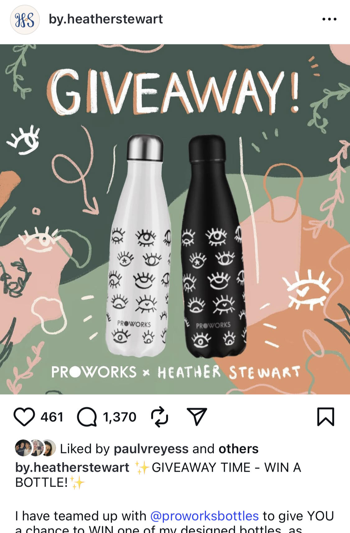 The company later decided to do a giveaway for these bottles which I was tasked with designing the post and posting this on social media. My first step was designing the layout - I decided to make the word 'giveaway' the focus alongside the bottles which would grab people's attention. I matched the design by using the same pencil-like brush and repeated the eyes to give it harmony.So the post's caption was clear to viewers I kept it simple and at the top stated that it was a giveaway and what they could win (as shown with the high qaulity images in the post itself). Buzz words were also capitalised such as 'win' to emphasise the giveaway if they skimmed over the text.The post ended up performing very well in a short time, with the entry requirements being to share with friends and post on your story. Therefore it got a lot of engagement, and hundreds of people were interested in getting their hands on the bottle. It was also a good experience to learn more about what makes a good social media post such being that an attactive design and clear instructions make people interested (not to mention free things)!