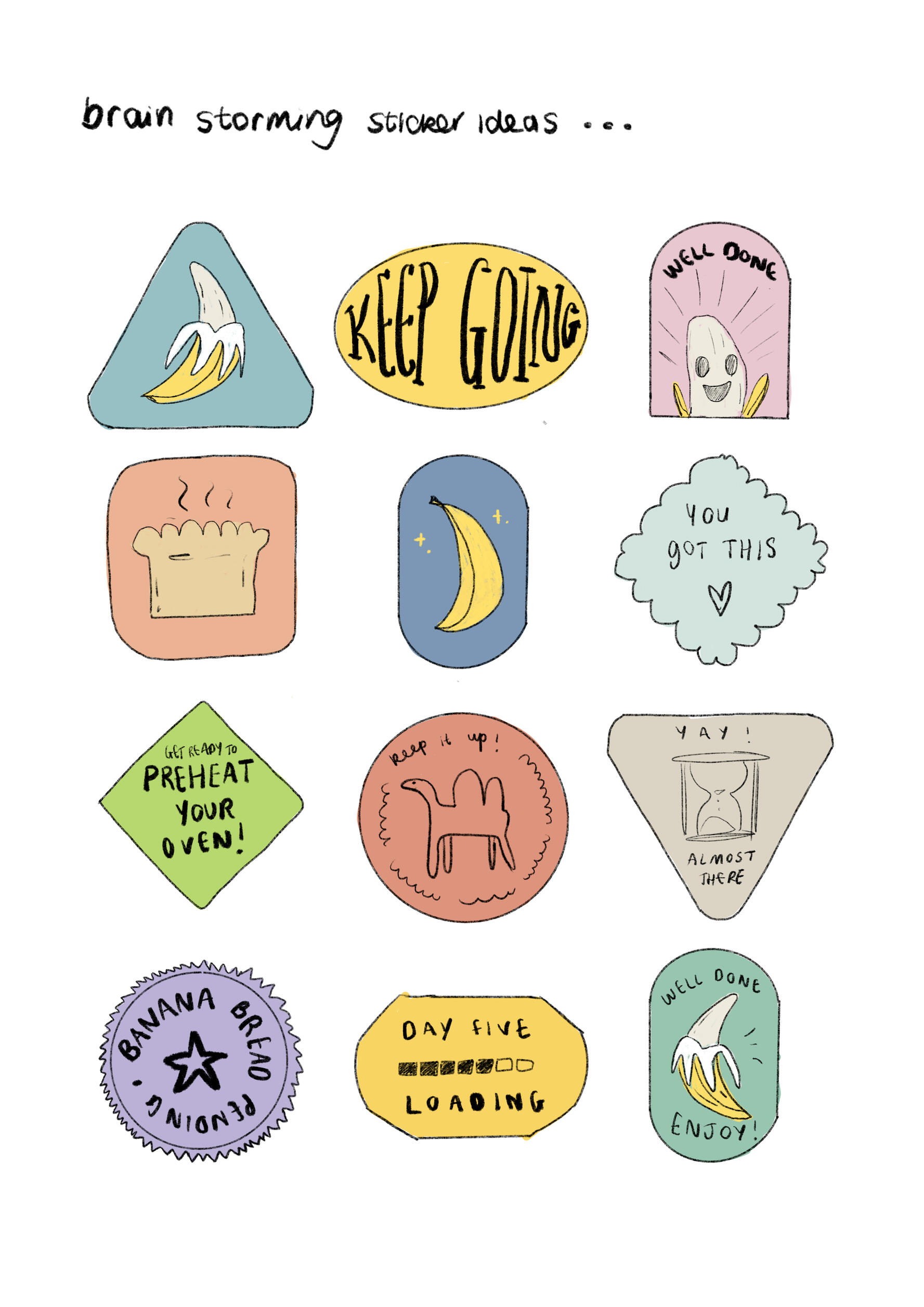 Some sketches showing my ideas for shapes of the fruit stickers being more creative and brainstorming how they might look. After researching symbols of patience for example there is a camel which I included in one. An hourglass also but that felt too ominous. The loading bar got good feedback as well as the banana sketch ones although I thought these were too obvious.I went and developed this theme further however and decided to make the bananas characters with costumes to make it more fun and unique. On the right is one of the first designs of a banana cheerleader. I tried adding words to the stickers depending on the characters going round the border. However after crating a few in different styles and fonts I realised it looked to cluttered and hard to read on the small size of a fruit sticker.